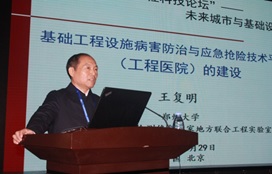 开幕式后,钱七虎院士做了《未来城市的绿色智慧基础设施》的主旨报告,分别介绍了未来城市的交通和城际交通,未来城市的供热与空调系统,未来城市的污水、雨洪集运和处理系统,未来城市的垃圾集运和处理系统,未来城市的智慧交通(动、静)系统,未来城市的智慧地下综合管廊等方面的内容,指出未来城市基础设施朝着绿色化、信息化和地下化的特点发展,这将给土木工程学科带来新材料、新模式、新领域与新分支学科的挑战。王浩院士做了《海绵城市建设及其地下空间开发》的主旨报告,从海绵城市的中国智慧、三大科学内涵、三大系统诊断、三大耦合平衡、三大基本途径阐述了“海绵城市顶层设计是海绵城市研究的科学范式”,重点介绍了城市加强地下空间开发的必要性、城市进行地下空间利用的优势、海绵城市建设地下水库关键技术,海绵城市建设综合管廊关键技术等方面内容,指出海绵城市建设中要大力开展地下空间利用,从全生命周期来衡量。王复明院士做了《基础工程设施病害防治与应急抢险技术平台(工程医院)的建设》的主旨报告,指出我国基础工程设施建设发展迅速,规模巨大,安全运行面临严峻挑战,结合具体案例介绍基础工程设施水灾害防治主要成果,而基础工程设施病害防治技术平台由工程医院、联合研究中心和基础工程原型试验场构成,将致力于多学科交叉的基础工程设施体检、诊断、修复、抢险综合服务。王院士还介绍了工程医院的建设内容、建设进展及下一步工作计划。